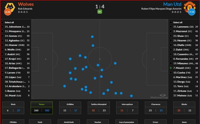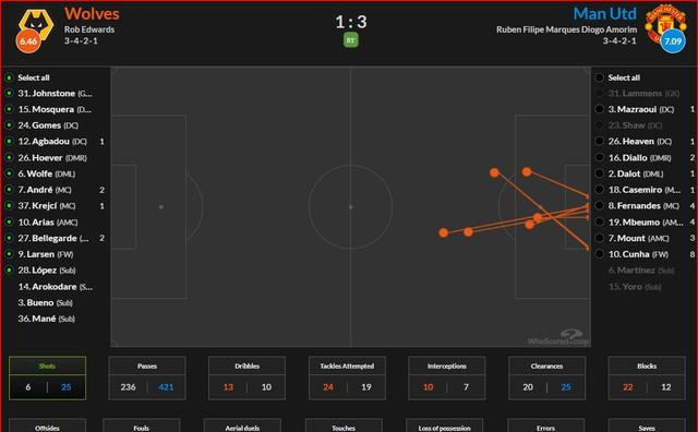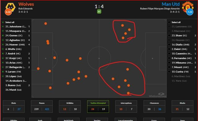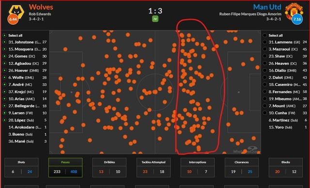 曼联这回终于跑起来了,球到脚下不磨叽了,处理得快。这可能也跟狼队自己人站得太靠前有关系,他们两边跟没人一样。你瞅狼队抢球,抢了二十多次,有十次是在曼联的地盘上。